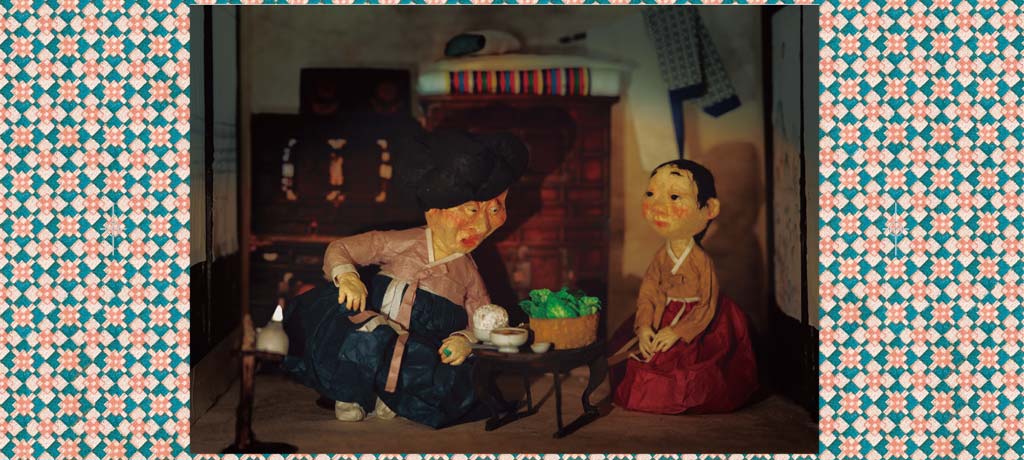白希那的作品特色之一即是多元的媒材,蝴蝶頁的古樸紋樣來自奶奶嫁妝的櫃子裡的貼紙,背景的自然風景則是實景拍攝,也正因為她想製作一個以雪山為背景的繪本,所以選擇了這個故事。她根據下雪預報,在江原道和首都圈的各座山間徘徊,略帶藍紫色的雪地照片顯得寒氣沁人。為了呈現洞穴場面中夢幻般的背景,她仿製韓國傳統民畫,用紙張創造的世界,與被火燒燼虛無縹緲消失的感覺也十分吻合,紙、布和軟陶製成的物件遠近交錯安置,讓畫面成為舞臺,特寫鏡頭和遠景鏡頭賦予了如同電影般的張力,也展現了白希那不斷追求突破的決心。