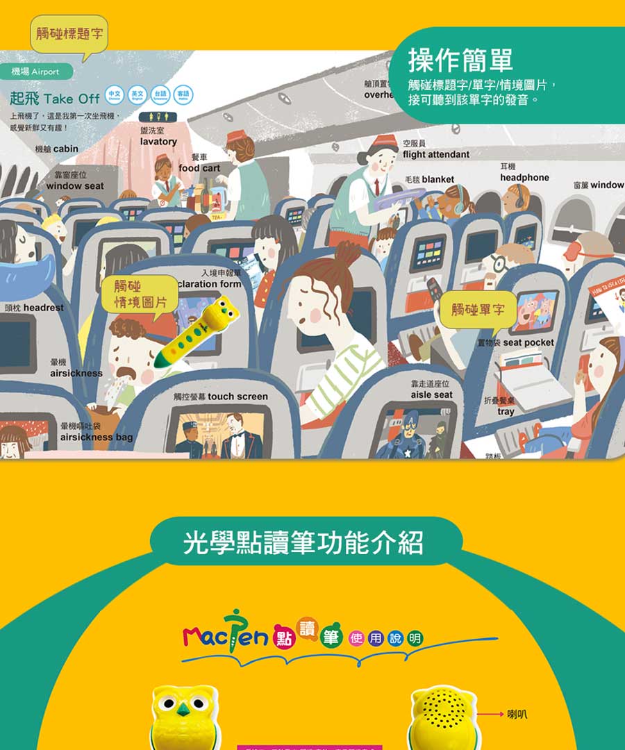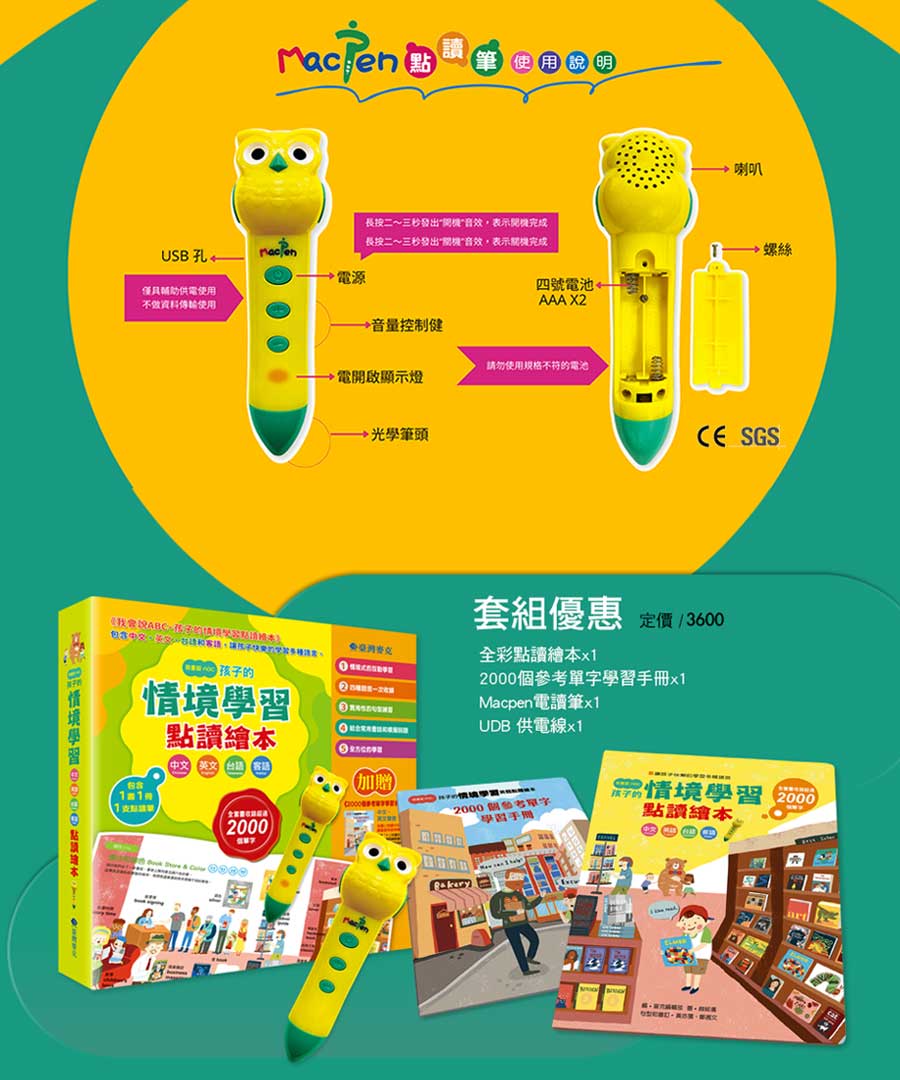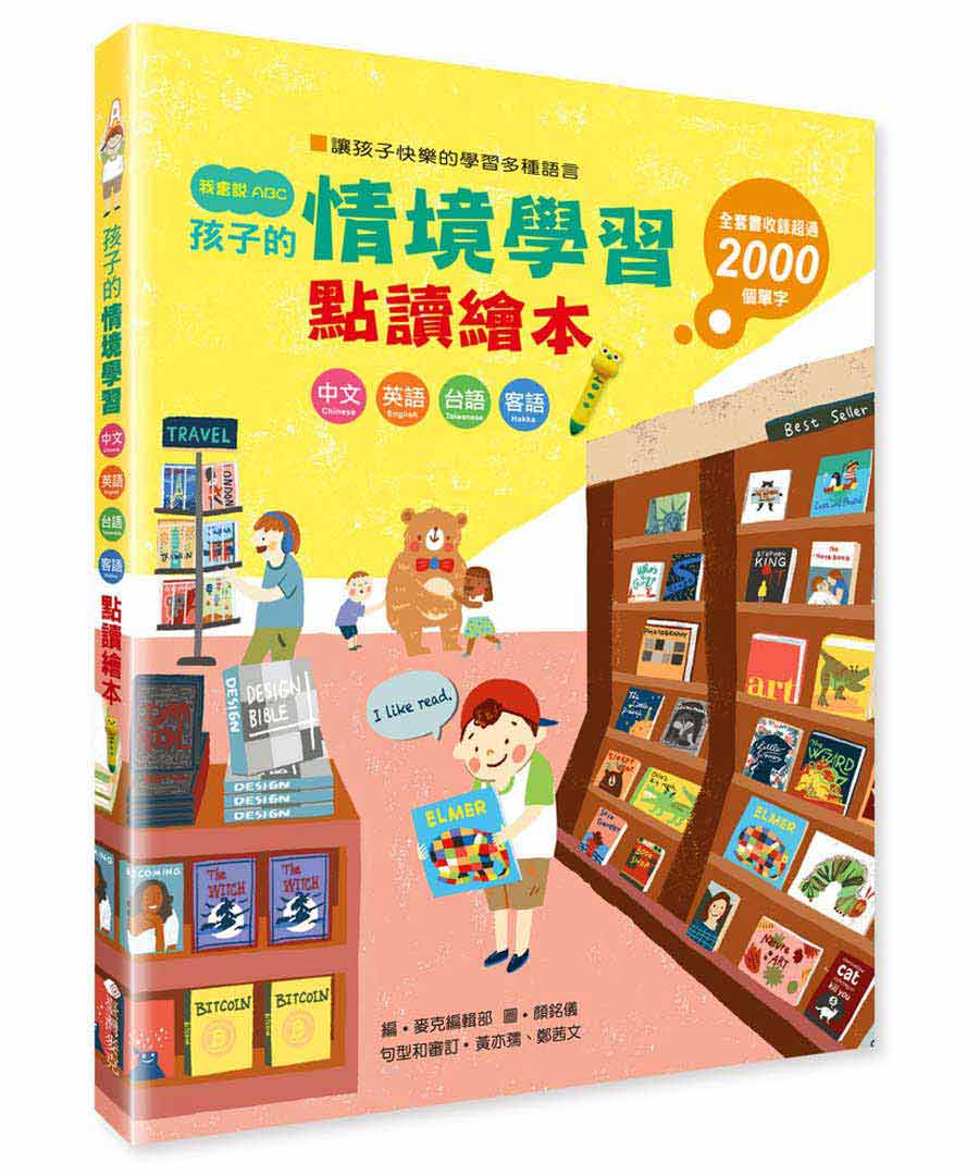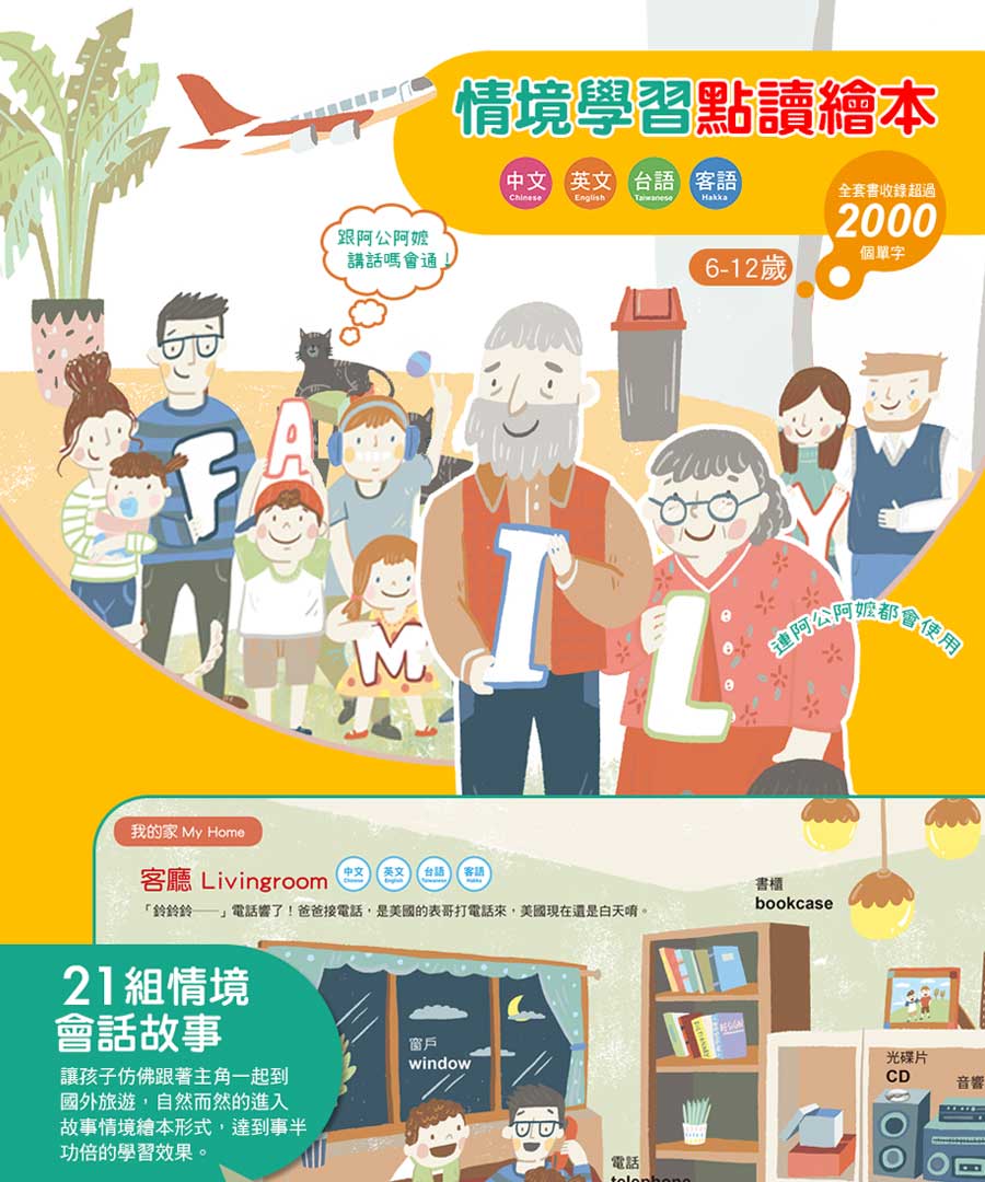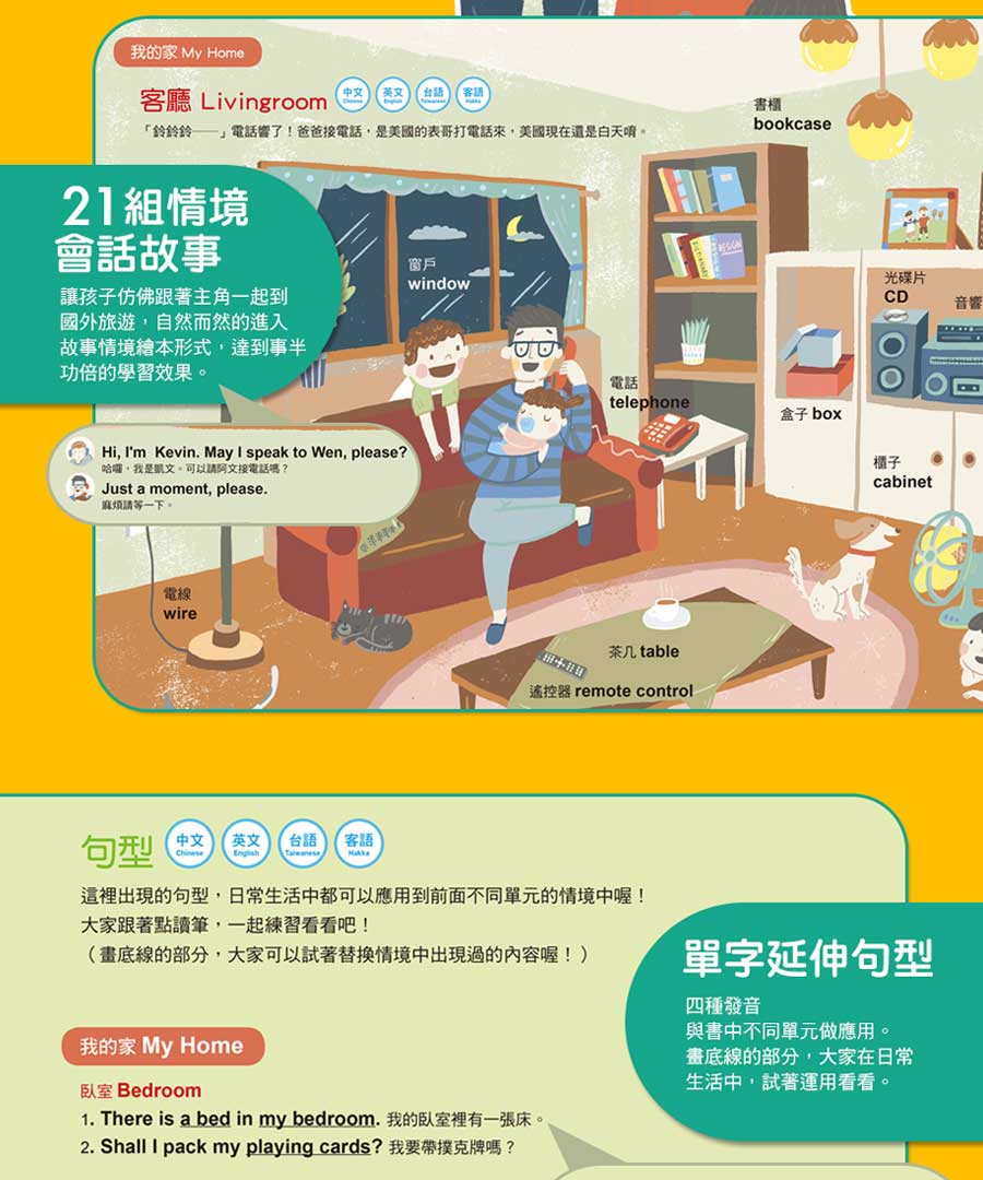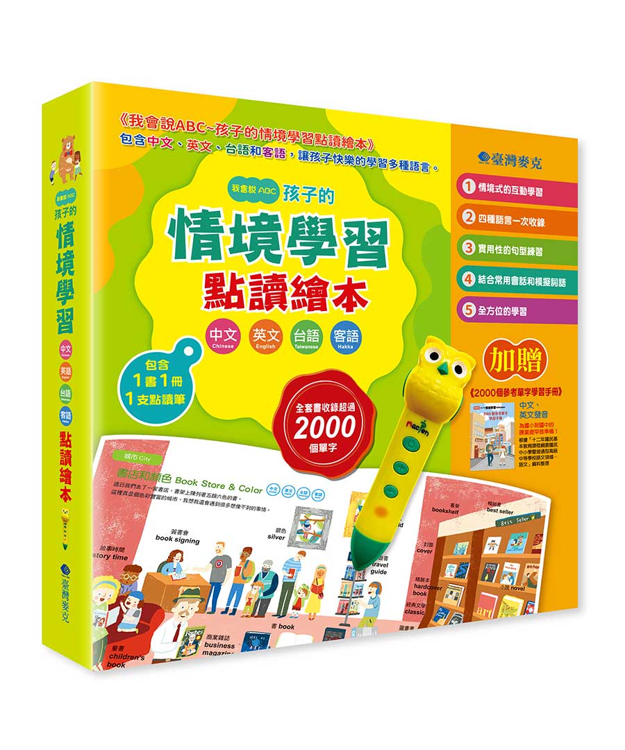 四種語言一次滿足:集合中文、英文、台語和客語四種不同語言,點讀市面上少見,整理了超過500 個小學生常用的單字、情境式的常用會話和模擬詞語,以及實用的句型練習。