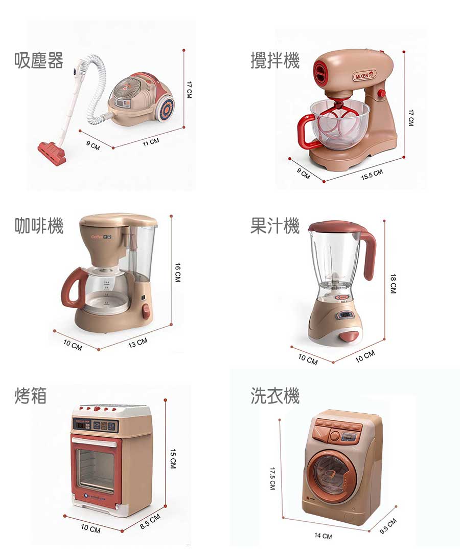【維京小子】聲光仿真家電6件組(咖啡機、烤箱、吸塵器、攪拌機、果汁機、洗衣機)