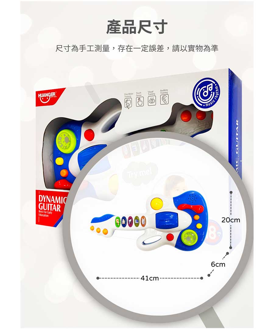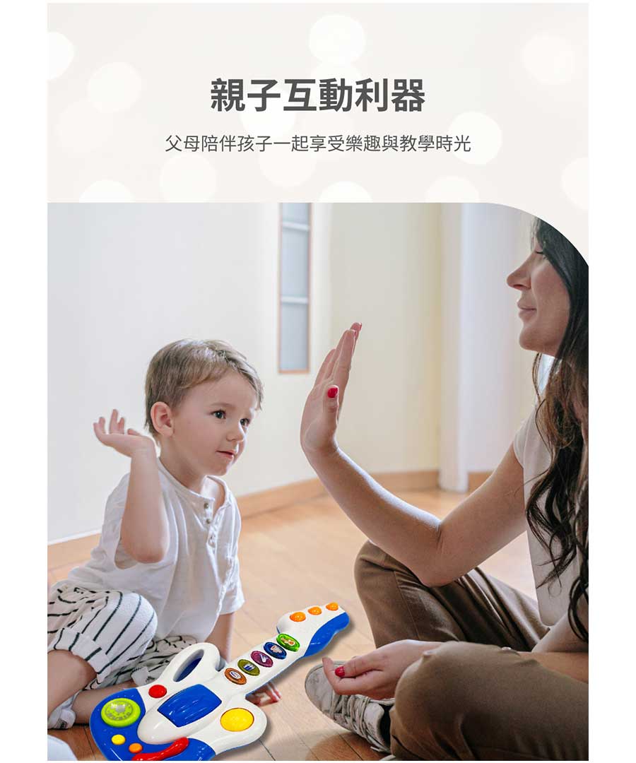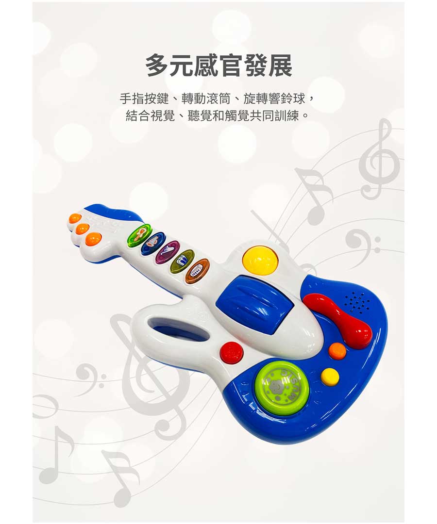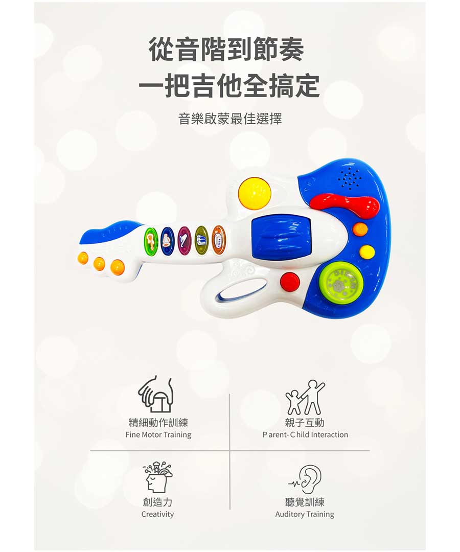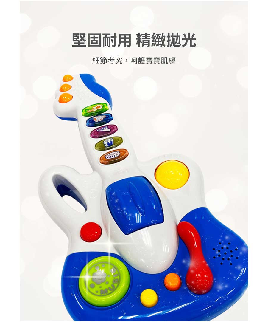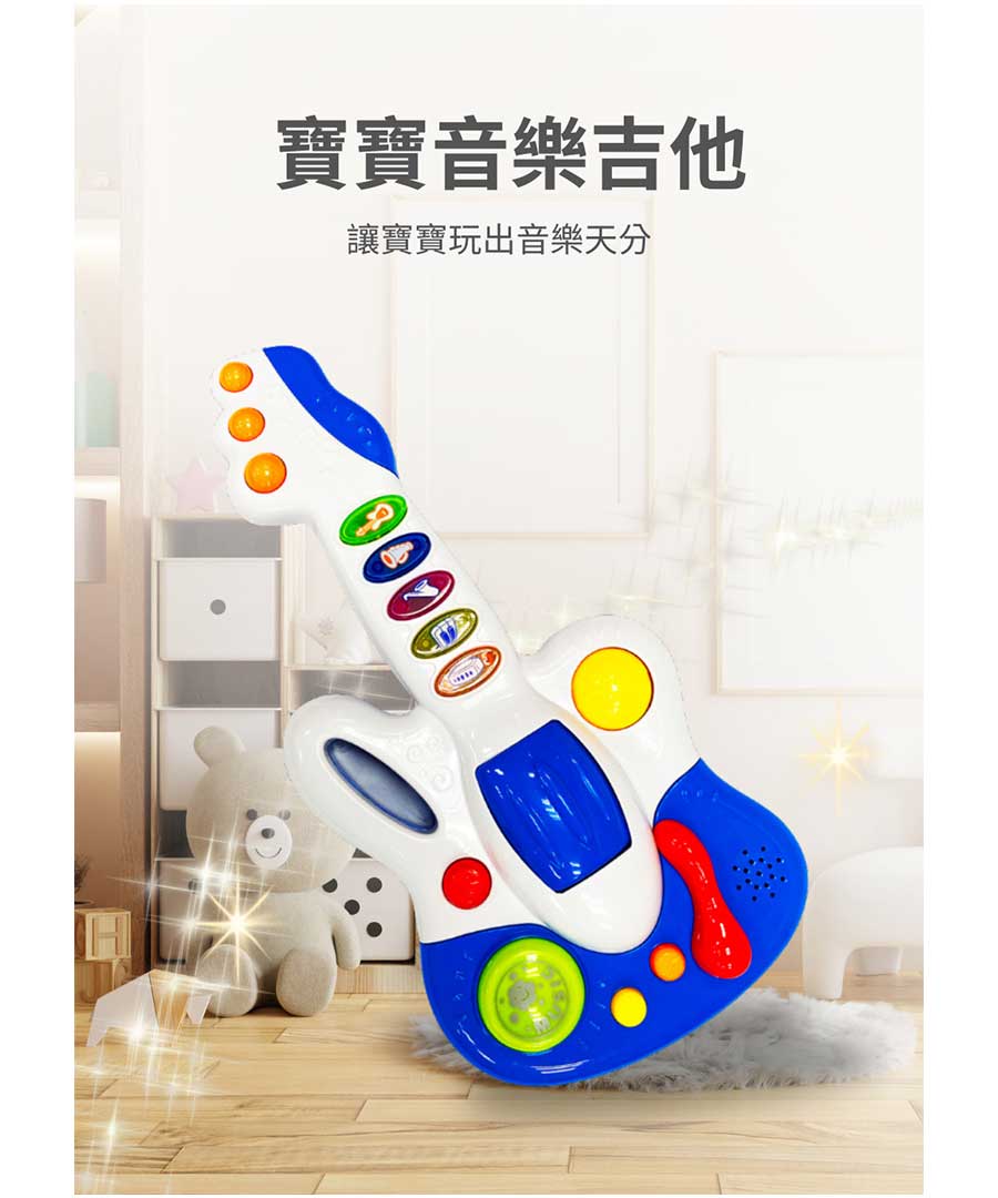 這款專為幼兒設計的音樂吉他,色彩鮮豔、造型可愛,結合多種音效與燈光效果,讓寶寶在遊戲中輕鬆接觸音樂世界。