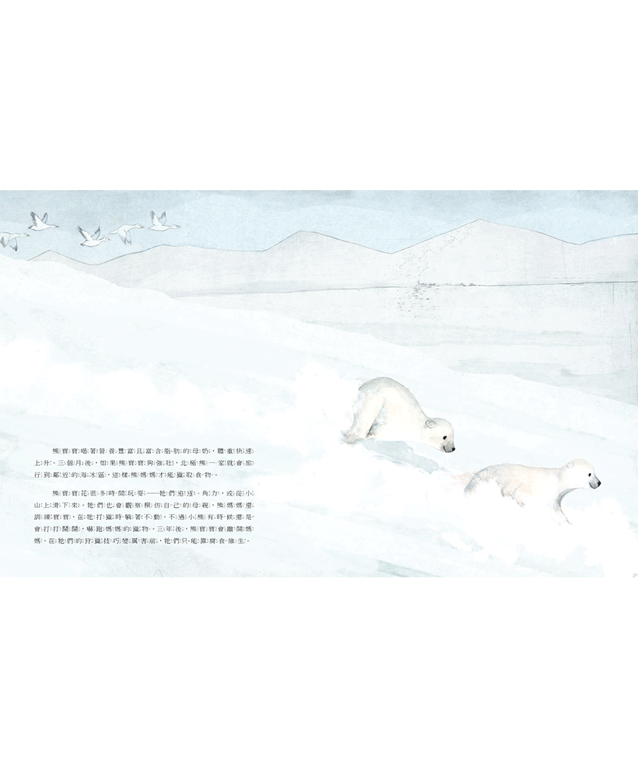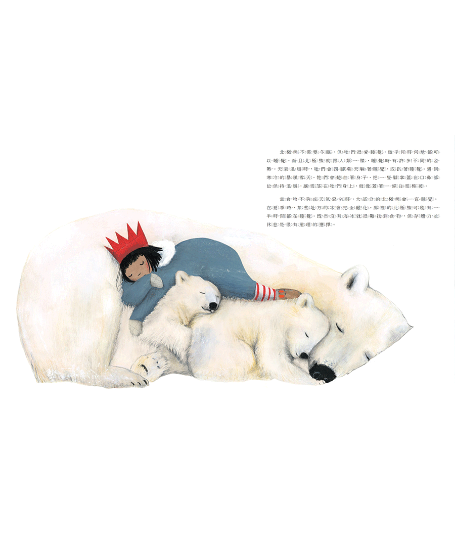 這是一個充滿想像的故事,小女孩將帶領我們進入北極熊的世界裡,了解北極熊的生活以及相關的科普知識。