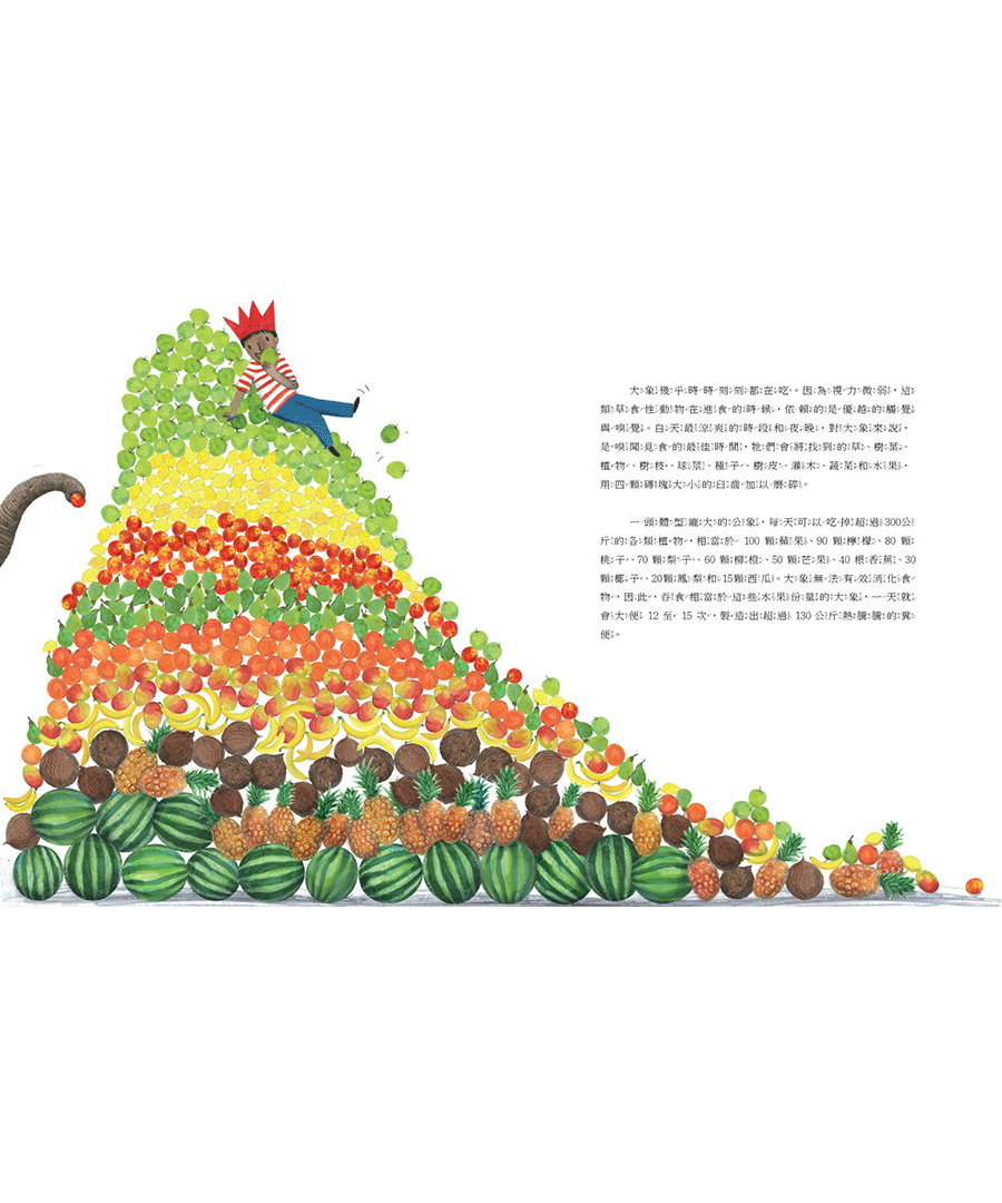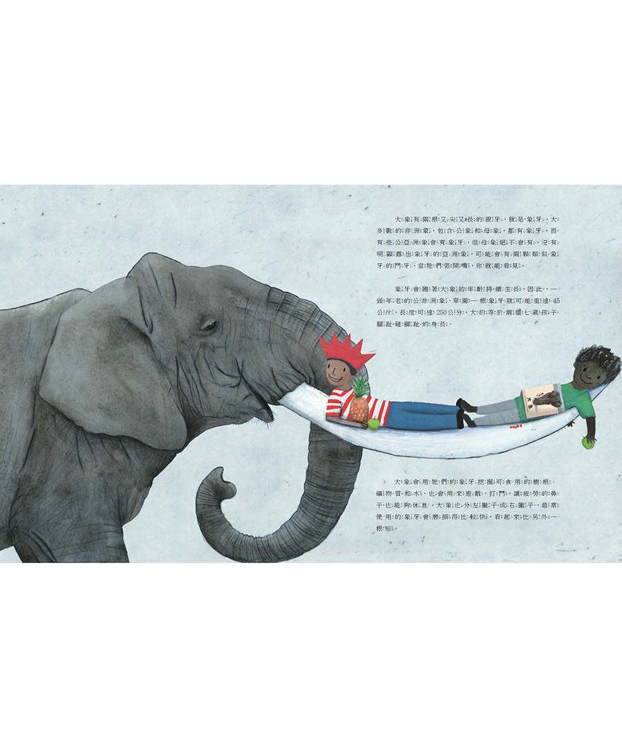跟著小男孩的腳步,一起認識這個世界上最大的陸上哺乳類動物吧!你知道嗎?大象的顏色其實是深淺不一的灰色。他們在走路時,都是踮著腳趾走路的,就像人類穿著高跟鞋一樣!本書以不同的視角以及美麗寫實的圖像,提供有趣好玩的知識,帶領讀者認識大象的生活以及相關的科普知識。