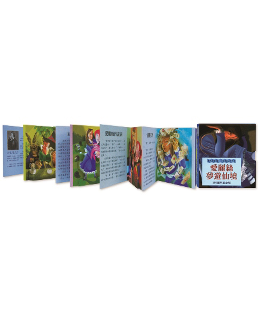 《愛麗絲夢遊仙境》於1865年首次成冊出版,至今年剛好屆滿150周年,藝文界紛紛推出相關紀念之作。而歷史悠久的英國皇家郵政也特別委託得獎傑出畫家,格拉姆.貝克史密斯繪圖、藝術總監戈弗雷設計,發行相關紀念郵票,為路易斯.卡羅爾的經典之作慶祝這個特別的時刻,並向愛麗絲這位永遠青春的少女致敬。這本立體小書,即是由英國皇家郵政授權圖畫,搭配原有故事文字,精選經典場面,讓愛麗絲迷們得以有更多元不同的收藏,亦是帶領新世代讀者窺見這本經典之作的奇幻美麗。